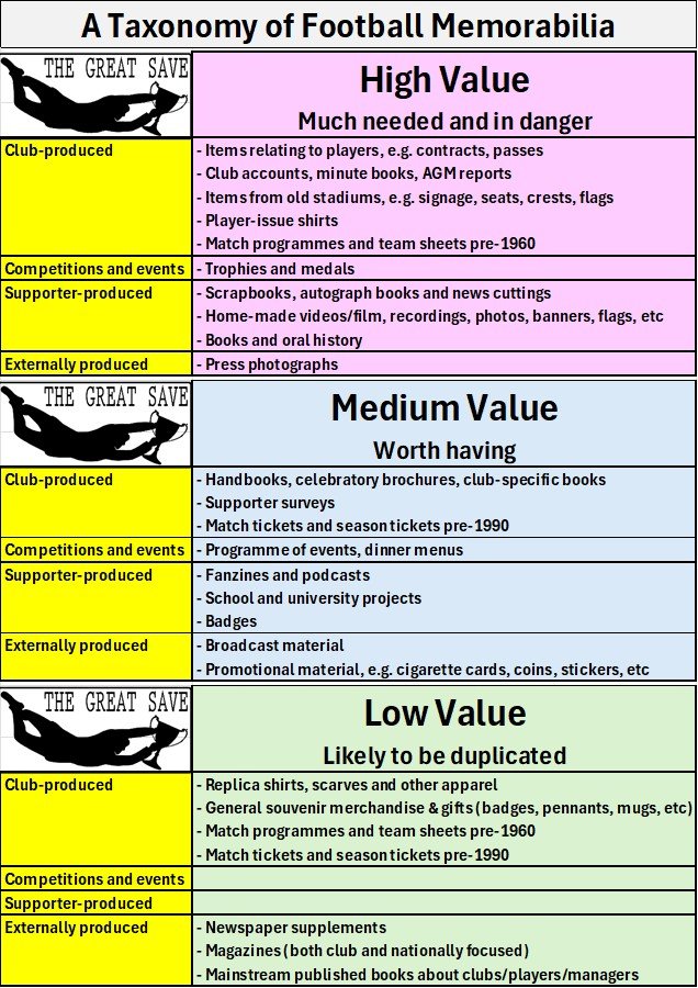 As a guide to items that we think are at risk and worth saving, whether for preservation or making a collection, we’ve created what we’ve called The Great Save Taxonomy of Football Memorabilia. It’s a downloadable PDF here.